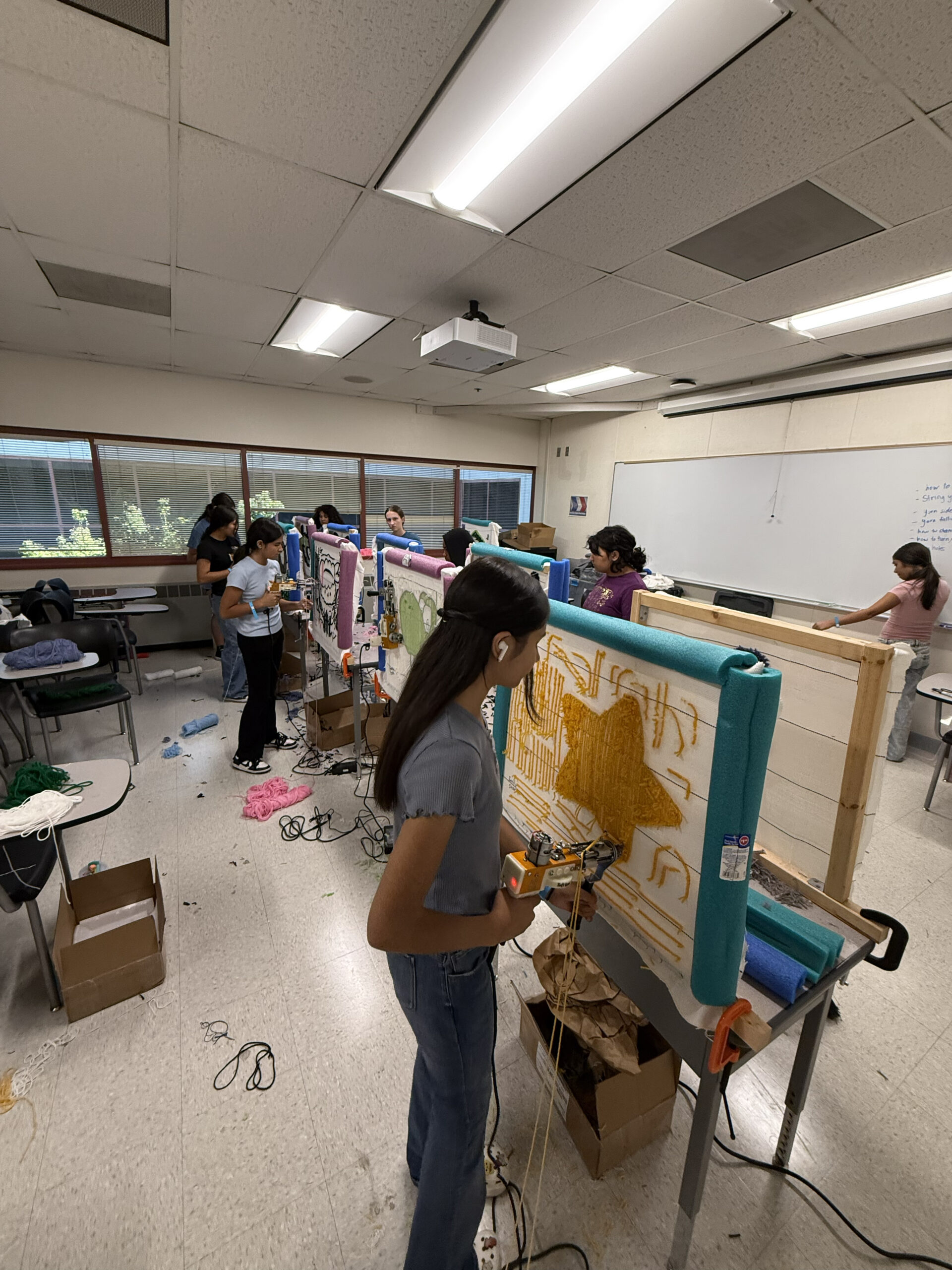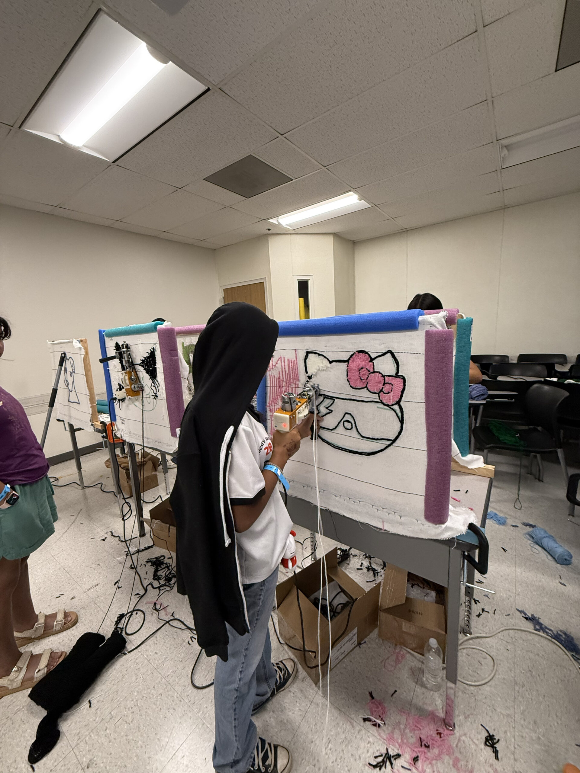 In Magic Threads – Rug Tufting, students learn how to design and create their own custom rugs using professional tufting machines. They begin by sketching original designs on paper and transferring them onto stretched fabric frames. Each student learns how to properly thread, control, and operate a tufting machine to bring their ideas to life with yarn, focusing on outlining shapes, filling color sections, and combining multiple colors and textures. Once the tufting is complete, students move through the finishing process—applying glue to secure the backing, trimming away excess yarn, and shaving the surface to reveal clean lines and smooth textures. They also attach their own backing fabric, completing the process from raw design to finished product. Every step emphasizes safety, attention to detail, and craftsmanship. All rugs created during the program belong to the students. Whether they complete one large piece or several smaller projects, they get to keep everything they make. Students who stay focused and apply themselves can finish several rugs throughout the program, building both skill and pride in their work while gaining a clear understanding of the full rug-making process.